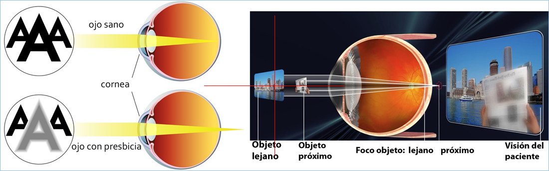 La presbicia es una condición óptica y visual que se desarrolla como resultado del envejecimiento normal del cristalino. El cristalino es la lente natural que tenemos dentro del ojo. Cuando intentamos enfocar objetos que se encuentran cercanos y a mediana distancia (un libro o un ordenador por ejemplo), el cristalino modifica su forma para ejercer su función de lente intraocular y conseguir un óptimo enfoque de las imágenes. |