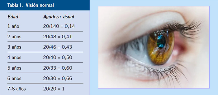 Es primordial saber que la AV se desarrolla desde que el niño nace hasta aproximadamente los 7-8 años que alcanza un nivel de adulto (Tabla I). |