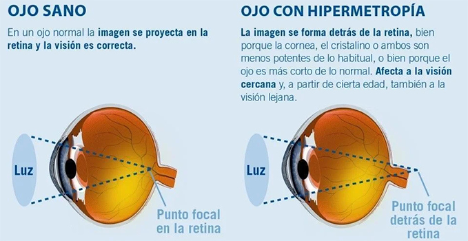 La hipermetropía es un defecto refractivo que provoca visión borrosa de los objetos que están cerca, ya que la luz que entra en el ojo se proyecta detrás de la retina y no sobre ella. |
