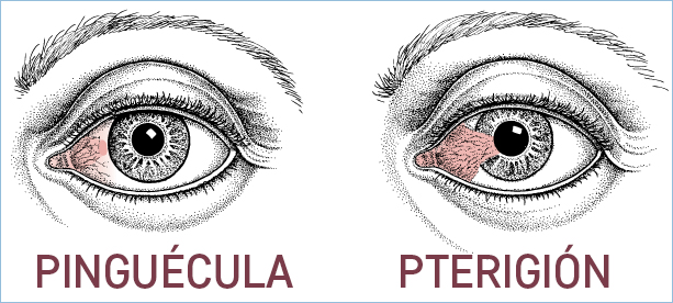 El pterigión y la pinguécula se caracterizan por ser una degeneración de la conjuntiva del ojo, de todos modos, no son lo mismo. La diferencia entre pterigión y pinguécula es que el pterigión es el crecimiento de un tejido carnoso que puede aumentar su tamaño, mientras que la pinguécula es el crecimiento de la conjuntiva, generalmente se identifica por su color amarillento formado por depósitos de grasas, proteínas o calcio. |