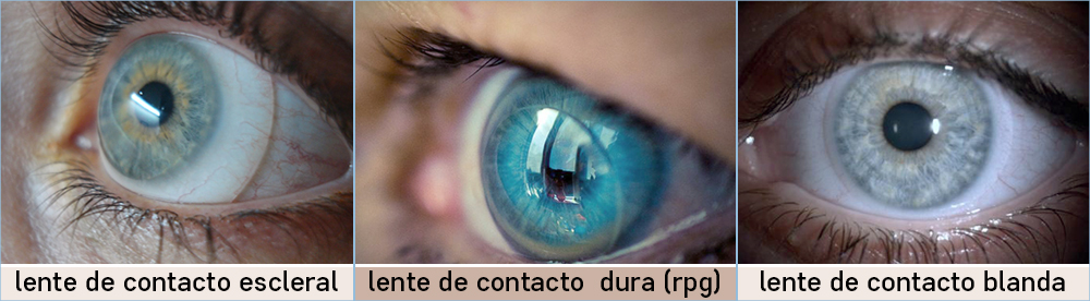 Lentes esclerales: Lentes de contacto rígidas de gran diámetro. Son lentes de materiales de alta permeabilidad (el mismo que para las lentes RPG) y así respetar la fisiología corneal y poder usarlas durante muchas horas sin perjuicio ocular. A mayor diámetro, la lente proporcionará un reservorio lagrimal (lágrima entre la córnea y la lente de contacto) dando una mayor comodidad proporcionando un respeto corneal mayor al alejarse más de la misma. |